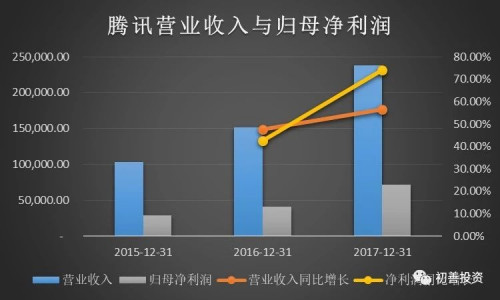 2017年,腾讯的营业收入达2377.6亿人民币,同比增长56.48%。归母净利润达715.1亿人民币,同比增长达74.01%。在腾讯这么大的体量下,还能像创业公司一样拥有爆发式的增长,可以说很难得了。