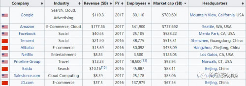 目前按市值排名全球前十名互联网巨头中,中国BATJ占据4席,其余皆为美国互联网公司(下图)。互联网巨头被全球第一大经济体和第二大经济体垄断,也可见中国互联网公司的实力也在全球占有一席之地。