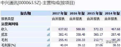 那么核心利润亏损的原因是什么呢?我们比较中兴和华为的毛利率,中兴的核心产品运营商网络2017年的毛利率是40%,较前三年还是增长的。