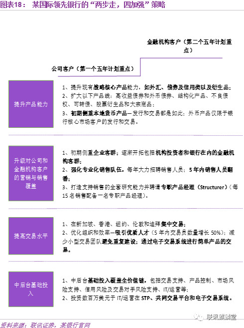 以某国际领先银行为例。该银行的主要经营区域覆盖了大量新兴市场国家,在2000年前后,这些新兴市场国家的资本市场开始发展起来,一方面对银行的传统负债和信贷业务中产生了一定冲击,但是另一方面也为银行发展证券销售和交易等代客业务提供了广阔的空间。在此契机下,该银行采取“两步走,四加强”的策略驱动金融市场业务向代客方向转型。