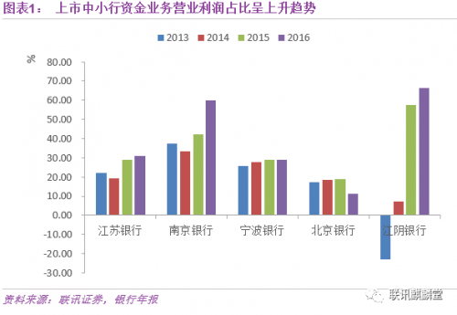 虽然横向来看,资金业务对营业利润的贡献率在各银行间迥然不同(各银行对资金业务的定义有所不同,所以资金业务营业利润占比横向比较没有意义),但是纵向来看,主要的上市中小银行资金业务对营业利润的贡献率是呈上升趋势的,在2016年部分银行仅资金业务就可以贡献60%以上的营业利润。