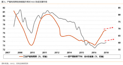1、第一个逻辑就是从企业盈利的角度,ROE连续七个季度反弹,今年盈利增速、收入增速、PPI价格中枢都在回落情况下,ROE继续往上走,背后的核心逻辑在于产能利用率的持续提升,其一、产能利用率使得中上游行业成本增速慢于收入增速,毛利率继续回升;其二,产能利用率背后是总资产周转率的持续提升。这支撑了ROE今年会继续维持在比较高的水平里。背后原因有两个:第一是从政策角度,持续进入工业集中度提升的阶段,趋势没有变。包括环保督察、安全检查,金融环境收缩,供给侧延续。不管是上市公司还是规模以上工业企业,他集中度和产能利用率都会持续提升。第二个,从微观,财务报表角度,一般用在建工程指标来代表产能周期,或者是设备周期。在建工程目前处于底部,在一季度增速刚刚转正,离在建工程转化为产能,转化为固定资产还需要更长时间,我们预计在1-2年之后。未来一段时间不会看到产能和供给的增长,反而在缓慢增加在建工程的过程中,需求端会出现提升。买建厂房的设备、原材料、工具、生产线上的机器,对于全社会都会缓慢增加需求,而供给还没有增加。产能利用率和总资产周转率还是会持续提升的。今年ROE水平会继续维持高位,对市场整体形成支撑。