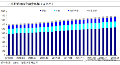 但目前股权融资占比太小,难以弥补债权融资的回落,今年社会融资增速将出现下降。从社会融资分布来看,2018年4月贷款、非标和债券融资余额占社会融资总规模的比重分比为70.7%、14.9%、10.6%,也就是说债权融资规模占比高达96.2%,相比之下股权融资占比仅为3.8%。今年前4个月,受到非标融资规模的萎缩,社会融资同比增速已经从去年末的12%下降到目前的10.5%,未来增速可能会进一步下降至10%以下。