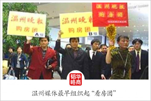 人们简直发现了一块新大陆,立刻把看房团的商业模式运作了起来。上海开发商迅速在温州三大报(《温州晚报》、《温州都市报》、《温州商报》)上猛砸广告,让报社变成了“看房旅行社”,3年间组织温州看房团近百次,次次爆满;《温州晚报》甚至趁势成立购房俱乐部,会员一度超过6000人。