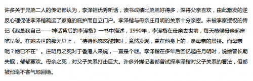 而1966年出生的次子李泽楷,按照个人兴趣读了电脑工程专业,感情丰富,与父亲的关系也一度紧张,尤其是随1990年庄月明过世后不久,李泽楷便搬出了李家大宅,被视为其独立宣言。