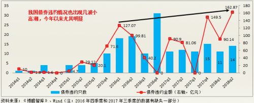 (二)2016年一季度、2017年四季度和2018年二季度的债券违约金额分别为127.07亿元、149.50亿元和162.87亿元,这是2014年以来单季违约金额超过100亿元的三个季度。可以看出,2014-2017年的三季度债券违约情况通常会有所好转。