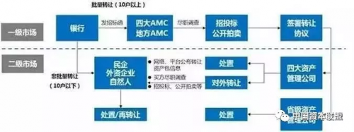 不良资产的市场与中国的证券市场类似,也分为一级市场和二级市场,其中一级市场特指国有商业银行和地方股份制银行产生的不良资产,这些不良资产只有具备资产管理公司资质的公司才能够购买及四大资产管理公司与地方设立的资产管理公司;既然银行在一级市场通过AMC出售了不良资产,那么二级市场上就需要对银行产生的不良资产进行处置,那么参与的金融机构包括AMC、私募基金、证券公司、信托公司等机构在拿到资产包以后,参与不良资产处置。