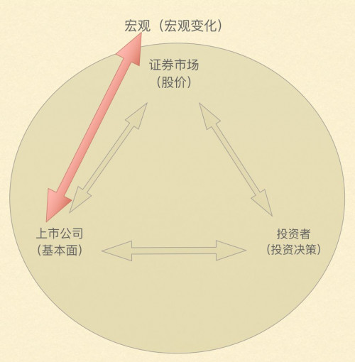 基于以上的认识,我建立了一个新的投资框架,一个大圆圈代表宏观(宏观变化),在这个圈里,三个小圆圈代表我(投资决策),上市公司(基本面)和证券市场(股价),它们三者用双箭头彼此连接,表示它们之间是相互联系相互影响的,三个小圆圈在大圆圈的里面,表示它们都受到大圆圈(宏观)的影响。