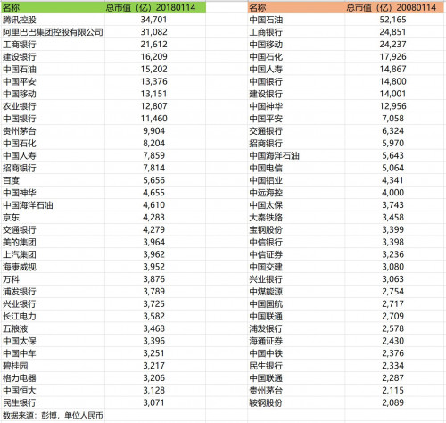 这两份统计表中,得出第一个结论,就是To C公司更容易成长为巨无霸,To B公司中的能源类公司一般需要各种政治资源,而To B公司中的非能源类公司一般需要非常强的技术,但由于技术颠覆太频繁,哪怕是大公司,一步没跟上可能就出局了。总的来说,To C的公司比To B的公司更容易成为巨无霸大公司。就我个人而言,我大部分的精力都是在研究ToC的公司,主要原因是由于To C的公司更容易亲自体验,也更容易理解。看了巴菲特的投资,2000年前基本全部都是ToC的公司,后来资产大了,也买了一些如电厂、铁路这些垄断的业务简单的公司。另外,我也查了下这两个国家2008年1月14日,也就是十年前,市值最大的前三十名公司的市值榜单,并和以上两张榜单的公司作对比,发生了不少的变化,比较显著的是:两国科技公司市值都在暴增,排名靠前,能源公司业绩普遍大幅滑落,排名下滑较多,但两地金融公司则差异较大,美国大金融公司市值增长还不错,尤其是Visa和Master两家信用卡公司,涨得很厉害。而中国金融公司市值普遍停滞不前,排名也有下滑。
