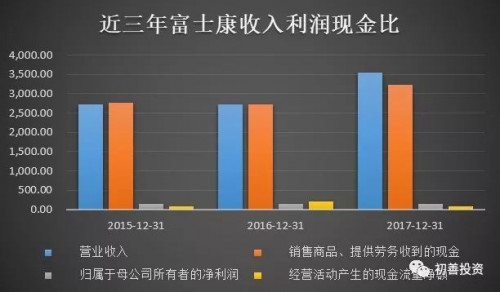 近三年来,富士康的营业收入分别为2,728亿,2,727.13 亿和3,545.44亿人民币,16和17年的同比增长分别为-0.03%和30.01%,不太稳定。而归母净利润则是143.50 亿,143.66 亿和158.68亿,16和17年同比增长是0.11%和10.46%。看样子,富士康作为一家成熟企业,的确是陷入了停滞,没啥成长性了。